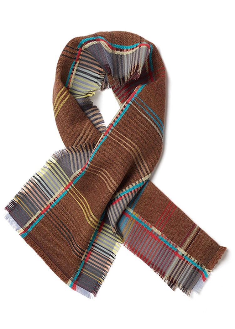 A variety of mossy hues, complimented by a bright teal throughout the basket weave and border. A chunky cosy wrap, woven in merino lambswool, with a pixelated motif running throughout,...