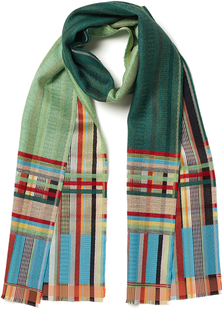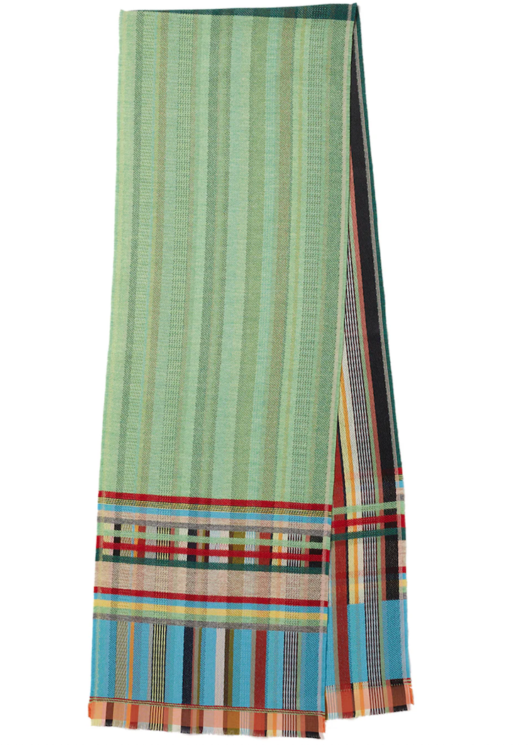 Rosa features a duo of bold lambswool woven on one-side with the silk stripe warp on the other. The border mixes both silk & lambswool in woven blocks and stripes, finished with a neat fringe.