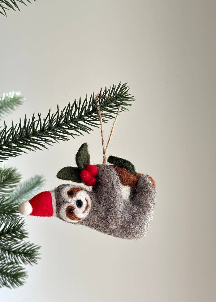 Introducing the Christmas Sloth Felt Ornament, a delightful addition to your holiday collection. Featuring an adorable sloth donning a Santa hat and holding a festive tree adorned with holly, this ornament brings a touch of endearing charm to your décor.