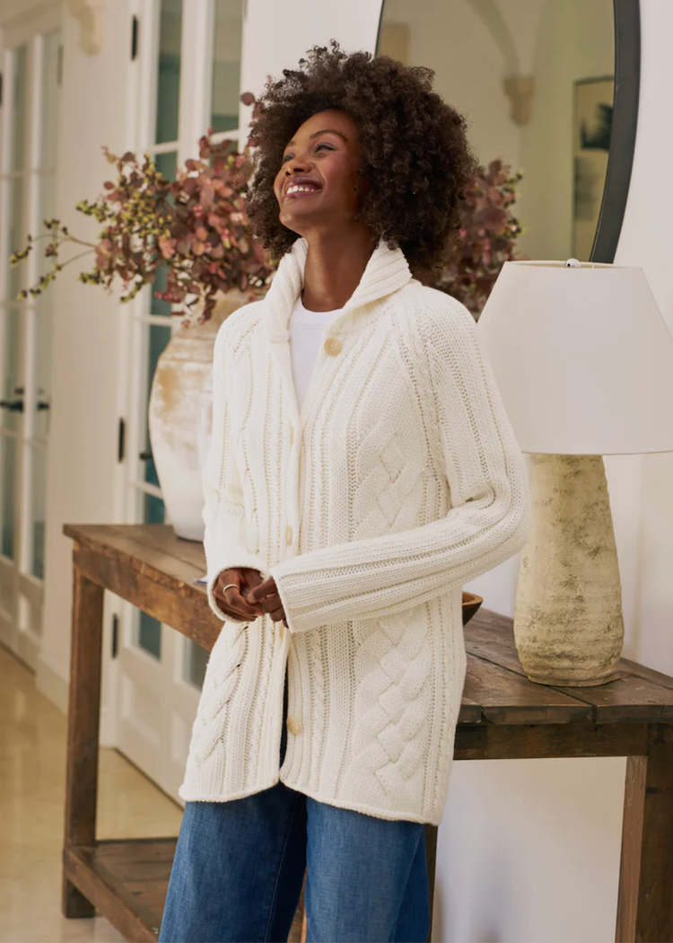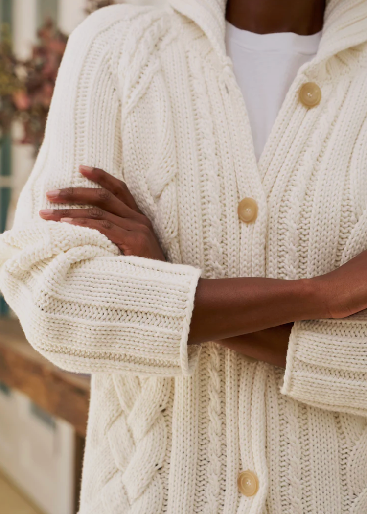 This cropped cable knit Cotswolds cardigan in luxuriously soft Pure Italian Cotton has all the signatures of the original—richly textured braided patterns, elegant horn buttons, and an exaggerated cozy collar–with...
