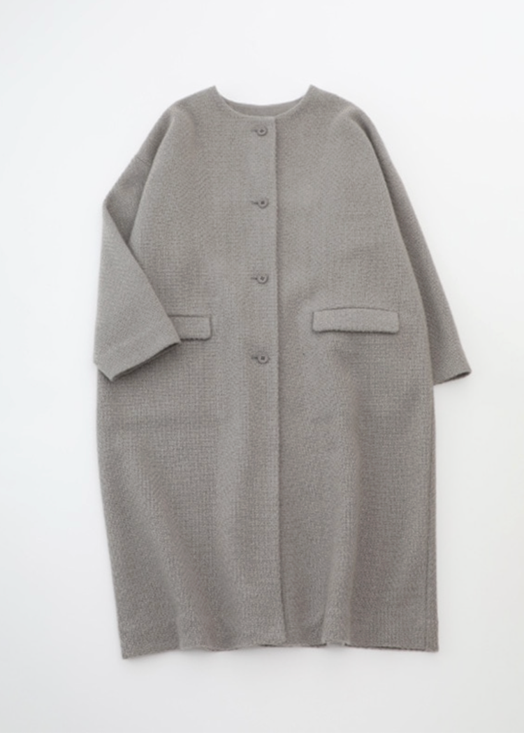 The thick woven yarn and the roughly woven texture, which allows glimpses of silk thread dyed the same color, create a warm atmosphere. This long coat has an elegant length. It's unlined, allowing you to experience the natural texture and warmth of the material. Layer it with wool or cashmere for added warmth in winter.