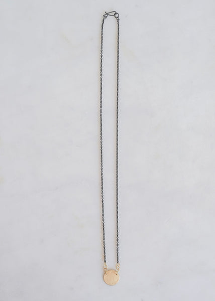 A textured 18k gold disk hangs from oxidized silver chain via 18k gold rings. Materials | 18k gold disk, oxidized silver chain, 18k gold links Length | 18" Disk Diameter |...