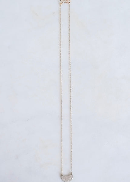 A parchment textured sterling silver crescent with 3 flush-set white diamonds hangs from 14k gold chain via 18k gold jump rings. Materials | White diamonds, sterling silver, 14k and 18k...