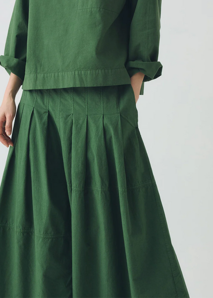 This skirt is made from a structured organic cotton linen poplin. Assembled in a panel design, it has knife pleats which bring volume and is finished with flat fell seams....