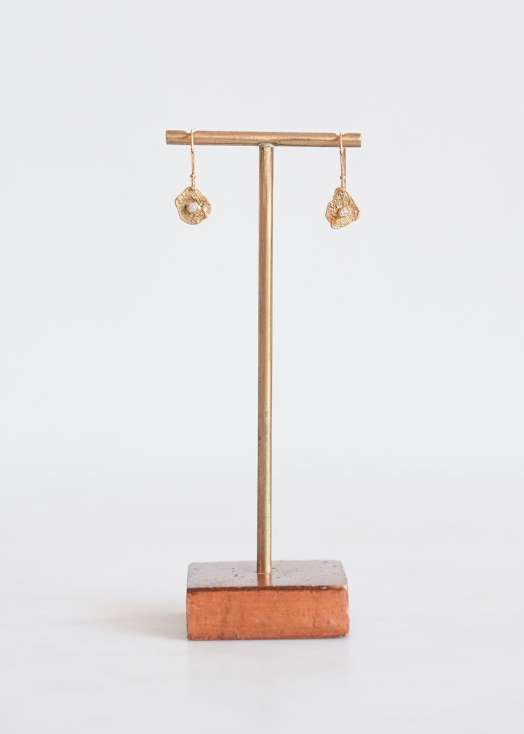 Hand-forged 18k yellow gold shapes with bezel-set white diamonds. 18k gold ear wires.