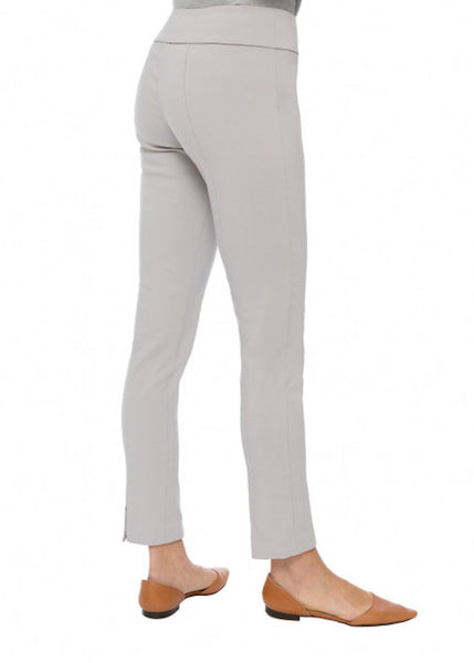 The perfect pull-on style ankle pant that's timeless with a slim-fitting stretch. Flat mid-rise elastic waistband. Elevated in design with a small back slit detail at end of the pant...