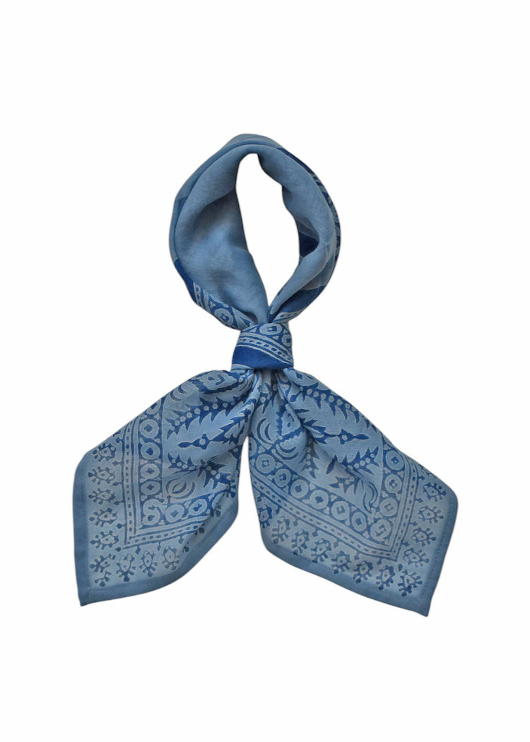 Inspired the calm state of laying outside and staring at the sky, the Angelite bandana was designed to bring beauty, ease and comfort into your wardrobe. Block printed onto super soft cotton, the Angelite will keep you warm around your neck and relaxed tied in your hair. Each batch of bandanas is printed with the same batch of dye and then dried out together under the sunlight.