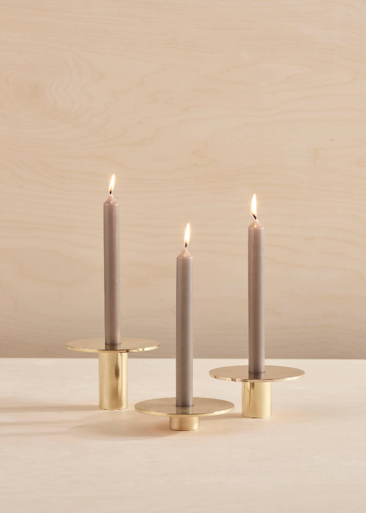 Eclipse candle holders are a striking minimalist design crafted from solid brass giving the product weight and substance. The wide disc frames the candle, while creating an illusion of floating above a table surface. For maximum effect use several clustered together to create a dynamic table scape.