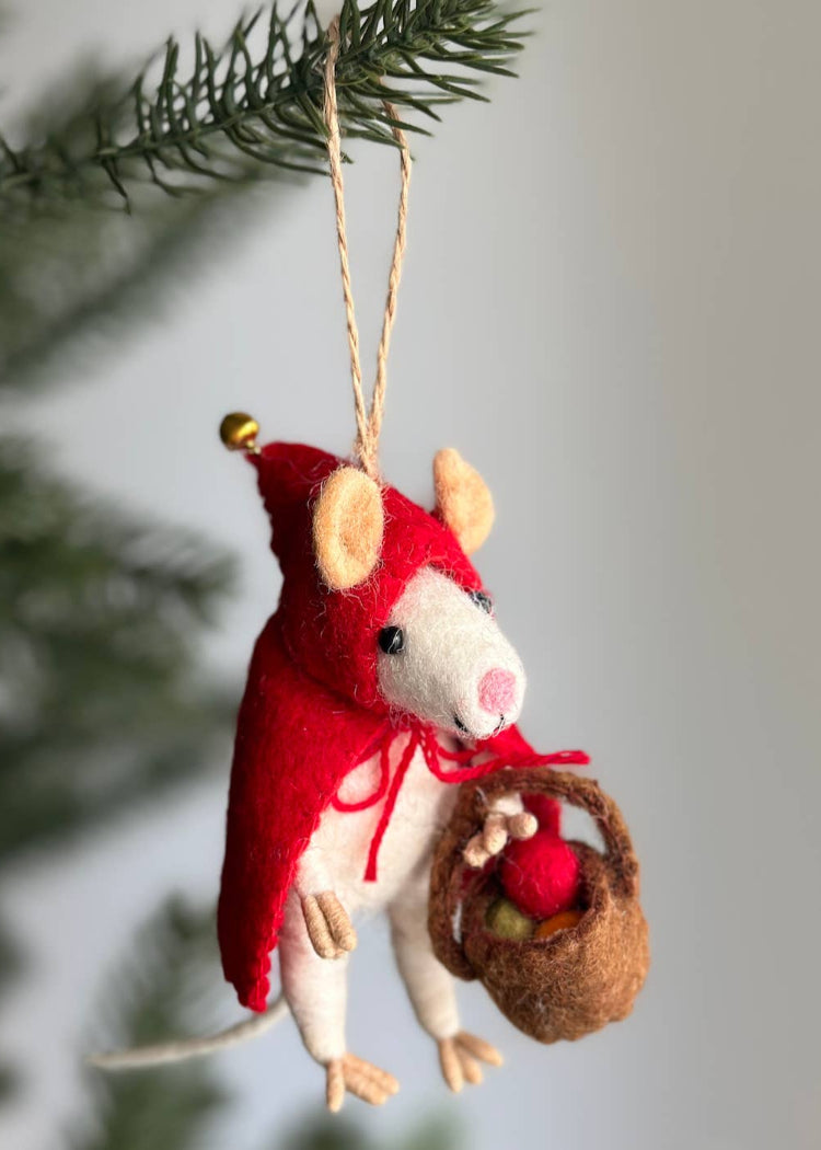 Meet Little Red Mouse-ette, a charming needle-felted mouse dressed as Little Red Riding Hood, complete with a bright red cape and an intricately detailed basket of colorful fruits. This whimsical ornament captures the magic of fairytales, bringing warmth and joy to any space.