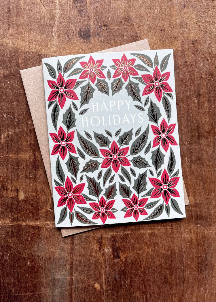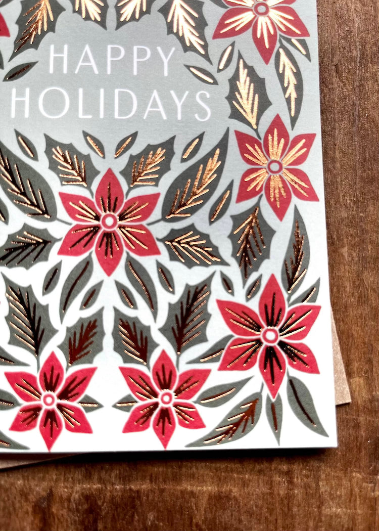 A Katharine Watson foil-stamped card, handmade in Portland, Maine, features real copper foil. For her foil-stamped cards, Katharine begins each design with a watercolor painting or hand-carved linoleum block, which is turned into a greeting card design and individually foil-stamped. Each card is blank on the inside, and comes with a 100% recycled kraft envelope.