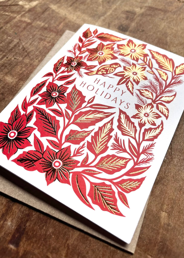 A Katharine Watson foil-stamped card, featuring real copper foil. Each card is a standard A2 size, 5 ½” by 4 ¼”, is blank on the inside, and comes with a 100% recycled kraft envelope. For her foil-stamped cards, Katharine begins each greeting card design with a watercolor painting or hand-carved linoleum block, which is digitally translated and later, individually foil-stamped by her printing partners.