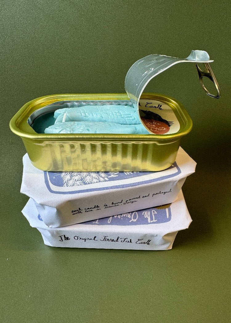 These hand-poured soy candles mimic sardine cans. The magic begins as you peel back the tin lid, revealing a whimsical scene reminiscent of actual sardines in a tin.