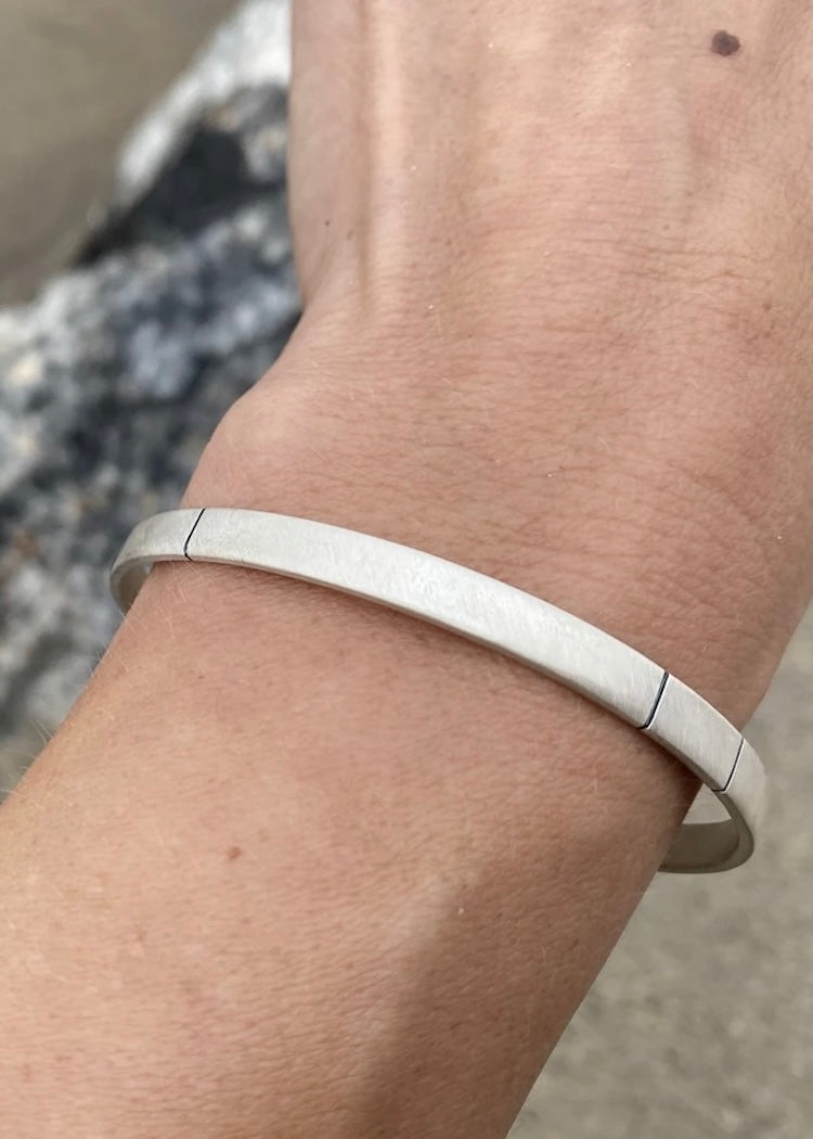 This 5mm wide, hand-hammered "Persona" cuff bracelet has three hand-carved lines that are oxidized and really pop against the silver. The oxidation is protected within the carved lines and therefore better preserved over time.