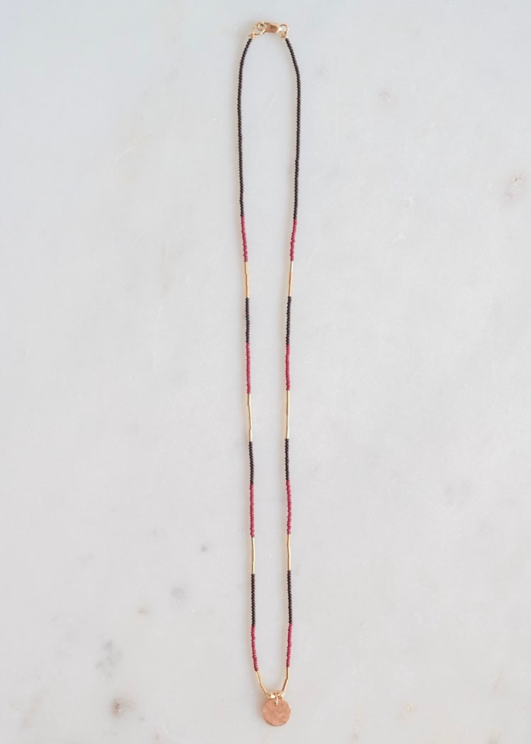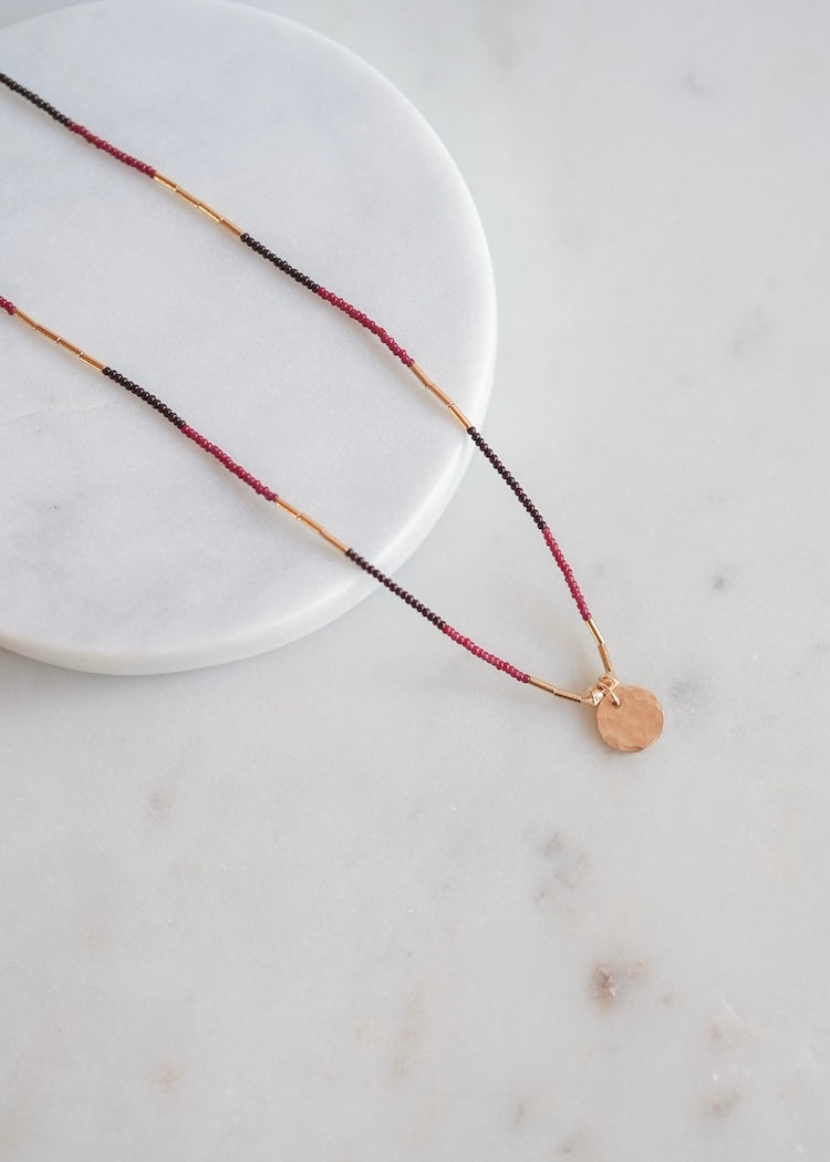 • Material | Dark Brown and Red Seed Beads, Gold Vermeil Charm