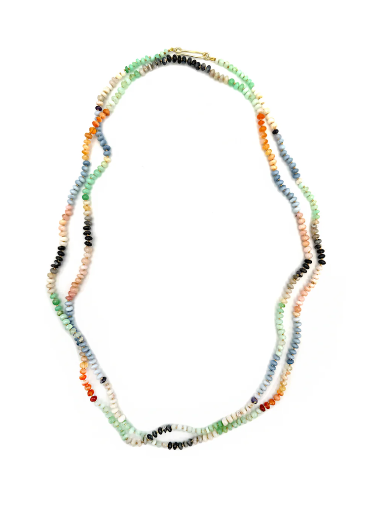 This colorful necklace is made up of mixed opal rondelles and strung on gold silk and knotted between each stone. This necklace feels like joy and features green opal, fire opal, blue opal, black opal, pink opal and white opal with my signature J-hook clasp in 14K green gold.
