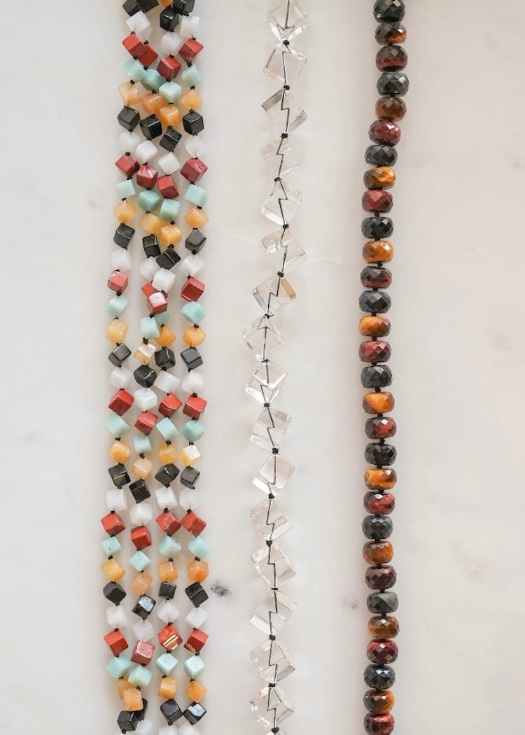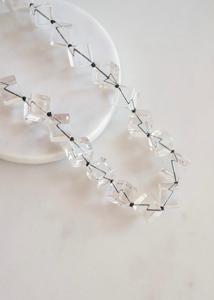 Patricia Von Musulin is known for her modern architectural clasps that come together like puzzle pieces. The clasp can be worn at the nape of the neck, to the side, or in the front. This beautiful, hand-knotted necklace is made with square-cut rock crystal. Rock Crystal is known to encourage emotional clarity and purity of the heart, enlightenment, peace, and calm. This stunning necklace is a contemporary stunner.