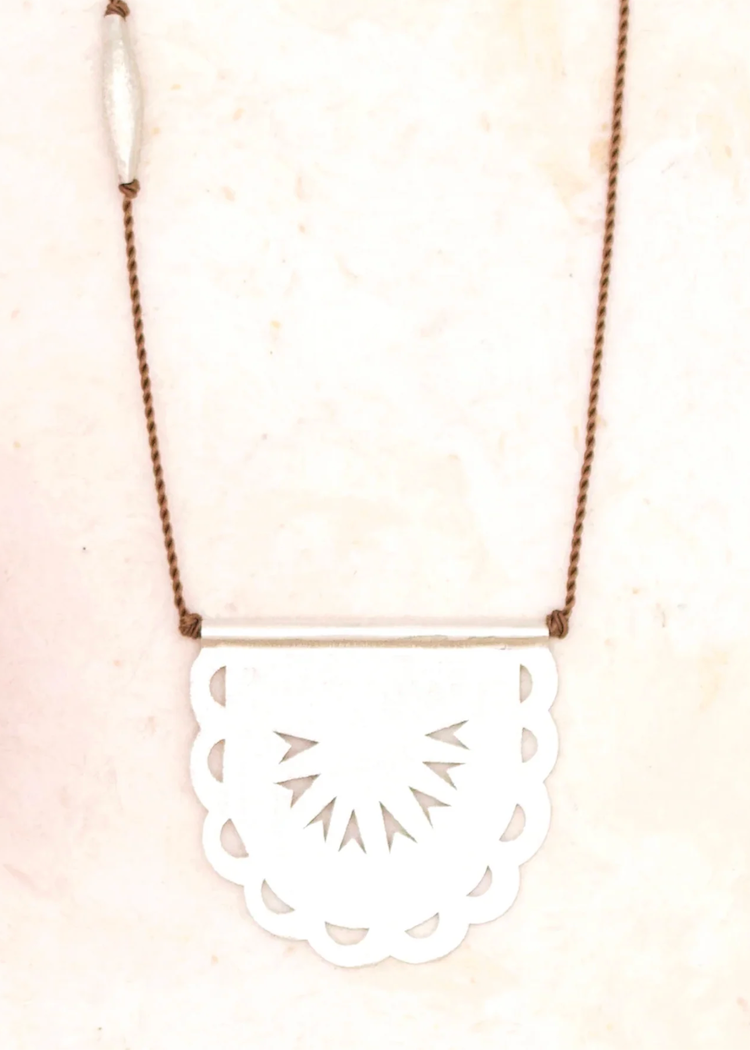 Inspired by joyful Mexican flags, hand cut, frosted sterling silver "papel picado" talisman. Strung on a taupe nylon cord, this necklace has handmade rice bead detail and carved pearl chrysanthemum flower closure.