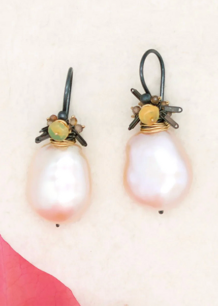 Lustrous Japanese cultured baroque pearls, tiny natural zircon and fire opal fringe. Oxidized sterling silver, french hooks. Materials | Pearl, Zircon, Fire Opal, Oxidized Sterling Silver Length | 1 1/4"...