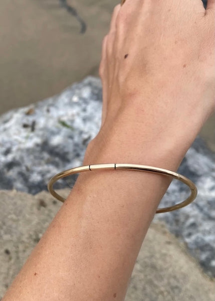 This 2.5mm wide, hand-hammered circular "Continual" bangle bracelet has six hand-carved lines that are oxidized and really pop against the gold. The oxidation is protected within the carved lines and...