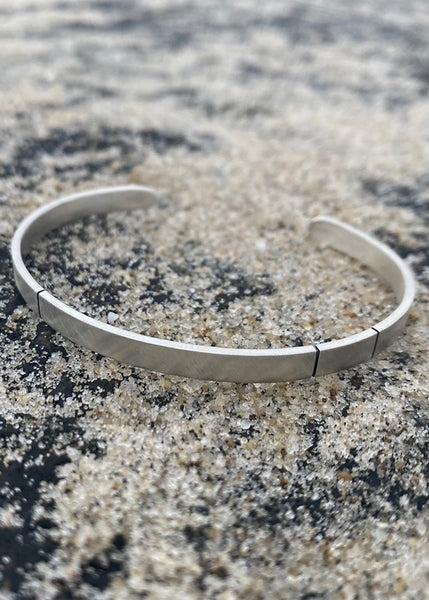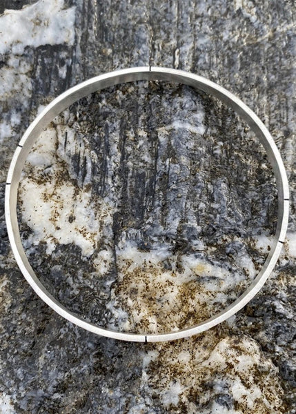 This 5mm wide, hand-hammered circular "Pitch" bangle bracelet has six hand-carved lines that are oxidized and really pop against the silver. The oxidation is protected within the carved lines and...