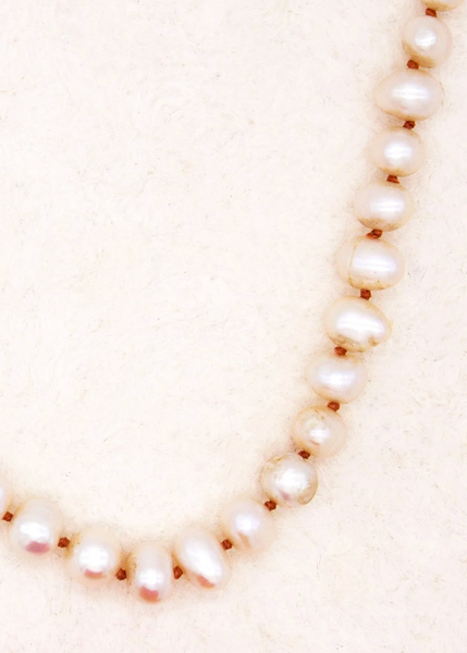 Creamy white antique pearls hand knotted on taupe nylon cord with handmade 14 karat gold closure & mother of pearl flower detail. Materials | Antique Pearls, Taupe Nylon Cord, 14k...