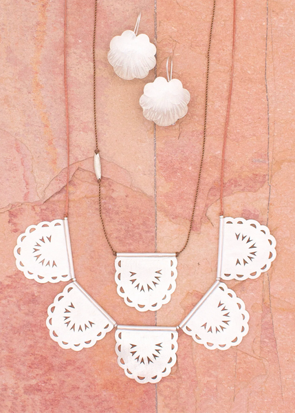 Inspired by the joyful cut paper flags that decorate the streets of Mexico. (p.s. River's favorite) Frosted sterling silver "papel picado" garland made of hand cut silver. A detailed statement...