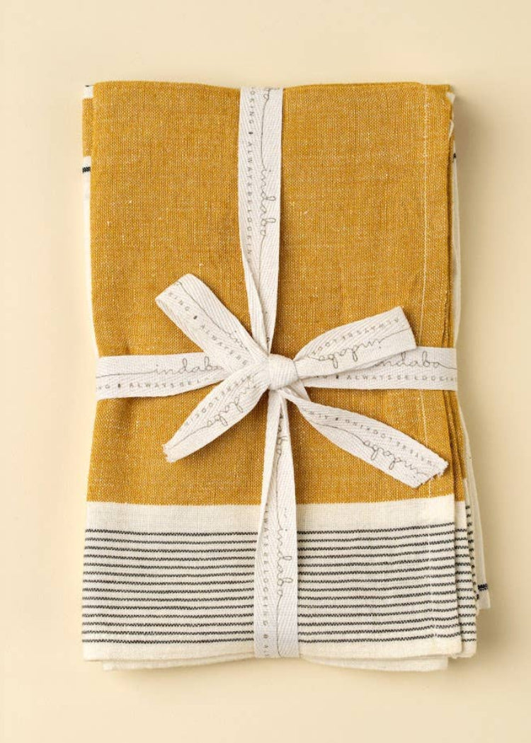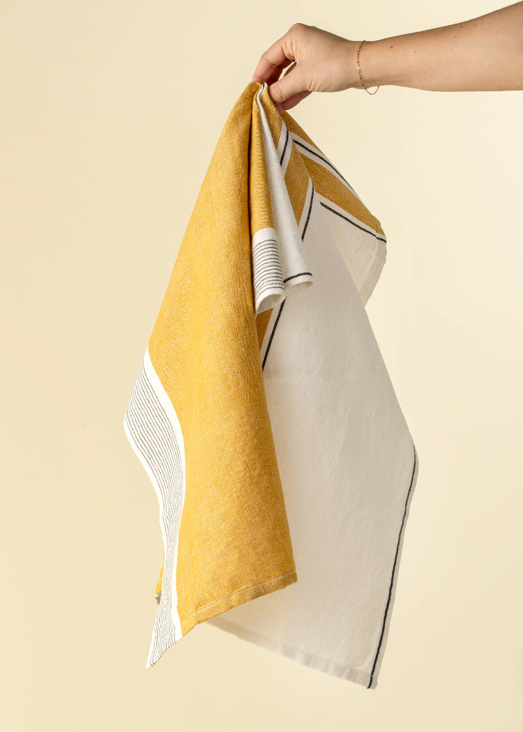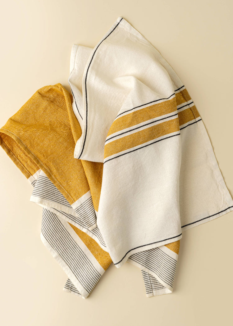 These French Stripe cotton-linen blend tea towels are handmade in India and are kitchen staples. Whether used to dry chefs' hands or delicate dishes, they'll add color accents, personality, and function to your kitchen. Machine Washable.