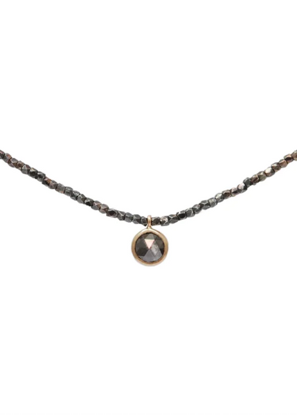 Opaque gray/black rose cut diamond gold bezel and Hill Tribe silver bead necklace. 14K bezel and clasp. *Please note: this item is part of our Trunk Show Collection and will...