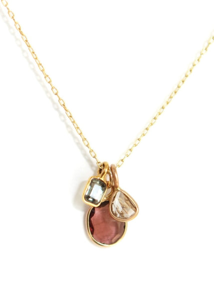 Sapphire, tourmaline and diamond charms cluster necklace in blue-green, dark pink, and white. Fine 14K cable chain and lobster clasp. *Please note: this item is part of our Trunk Show...
