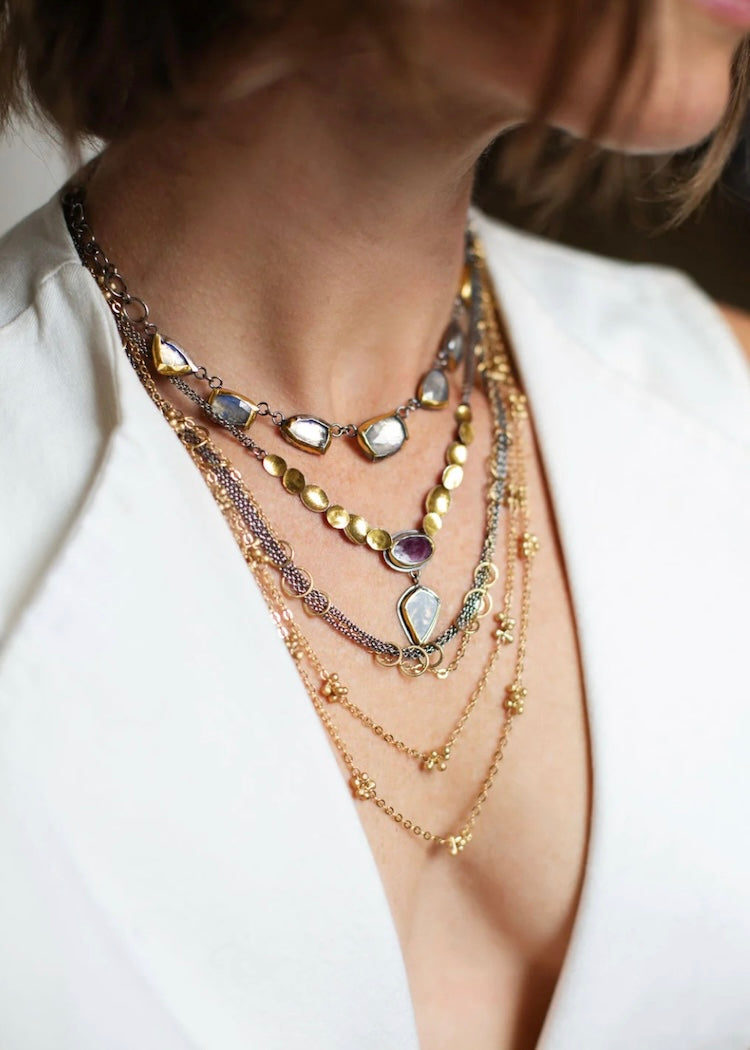 The links of this necklace resemble lemon slices, creating a fresh but fun piece. Falling right at the collarbone, you can wear this necklace with multiple necklines. Hammered sterling silver...