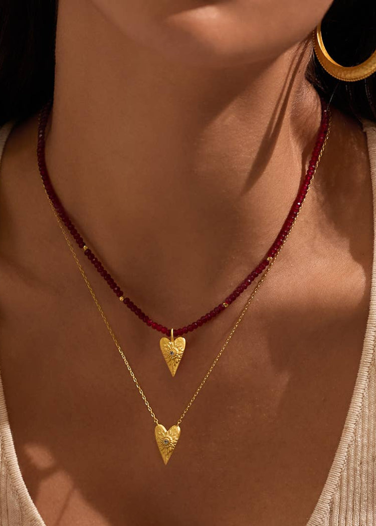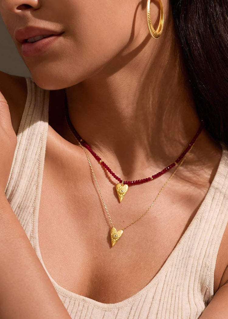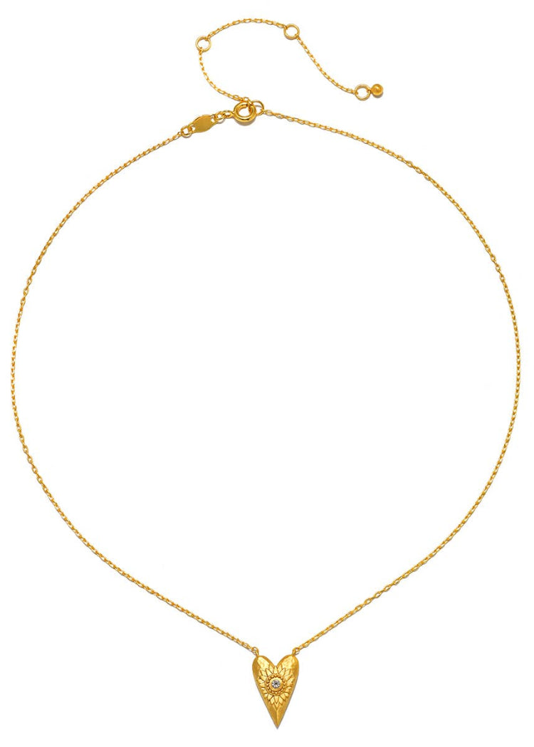 A heart pendant necklace in 18kt gold plate is inscribed with a detailed flower and accented with a gleaming white topaz, stone of individuality, creativity, and awareness. On the back, a delicate inscription reads the mantra: I Am Loved.