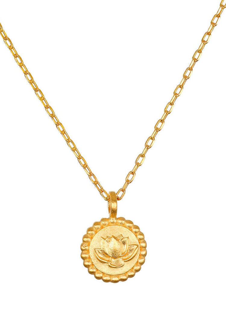 Here in the mud, the lotus flower emerges, awaiting to bloom into its full beauty. An 18kt gold plated necklace is adorned with a delicately engraved lotus flower, the revered ancient symbol of new beginnings and full potential. Intricate beading on the outer edge of the pendant completes the look. Wear this meaningful necklace to be reminded of your own emerging potential, or to inspire transformation.