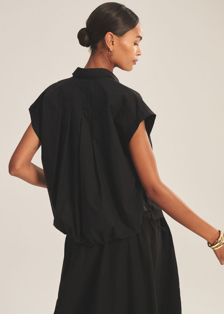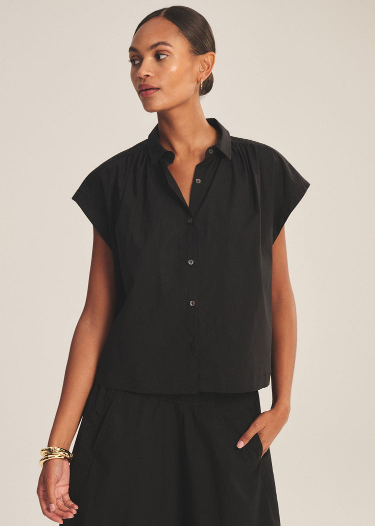 Designed with just the right amount of movement, this top is crafted from crisp cotton poplin for a polished, easy feel. Featuring cap sleeves, a classic collar, pleated shoulder detailing, and a button front with a cinched corded hem, it offers an adjustable shape that’s effortlessly versatile.