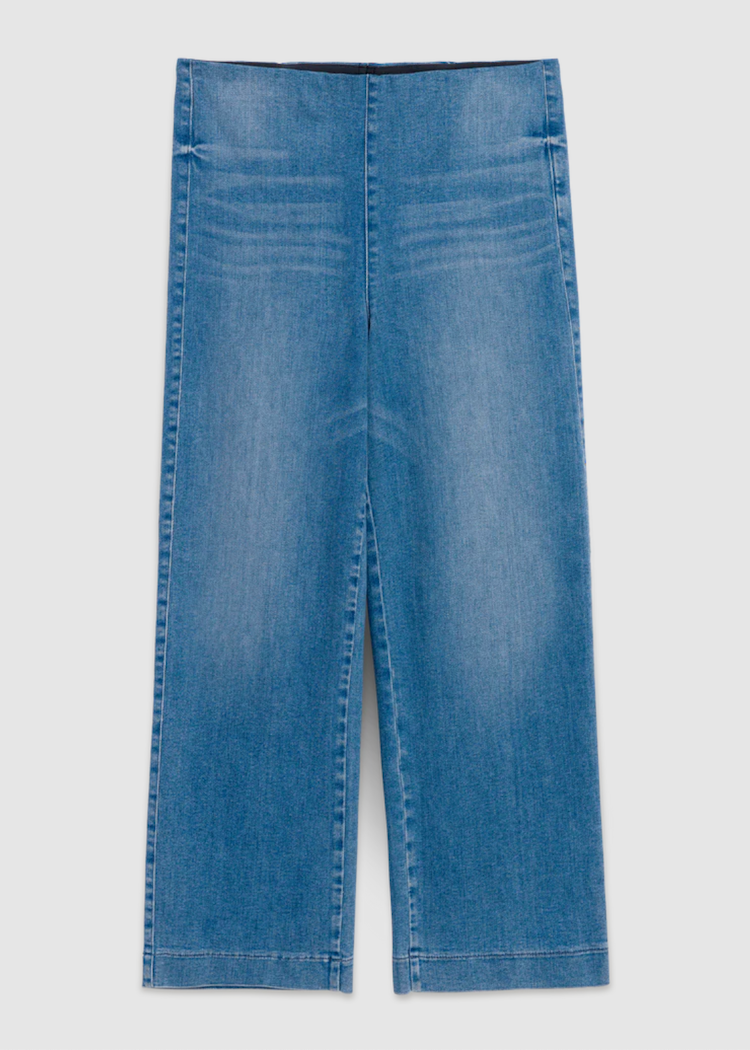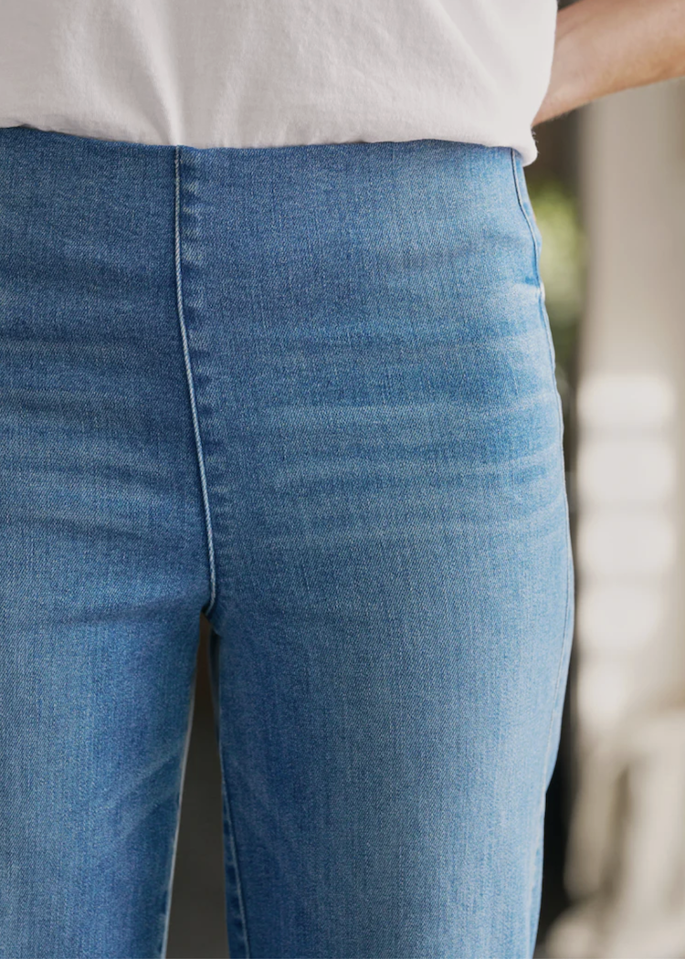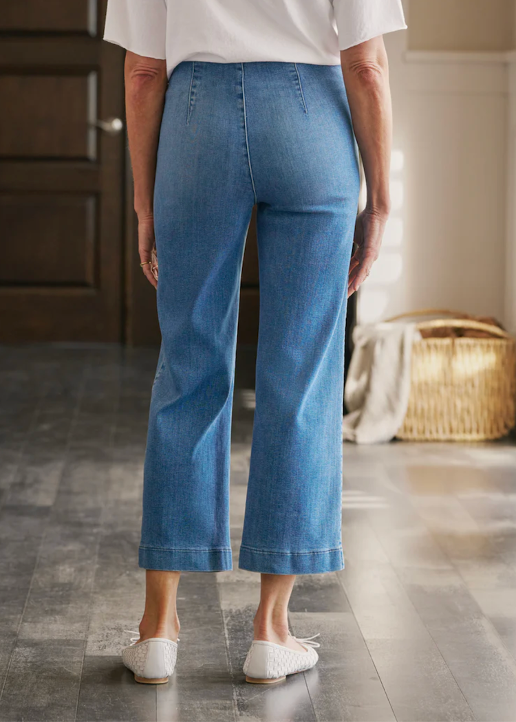 Introducing Westport Illusion, the ultimate Italian Wide-Leg Pull-On Jean in F&E iconic Italian Dream Denim. A smooth, hidden contour waistband and elevated finished hem create an outrageously wearable jean—minus the fuss of pesky zippers and hardware! Designed to gently curve over your hips and sit at your natural waist with a wide-leg fit and cropped length.
