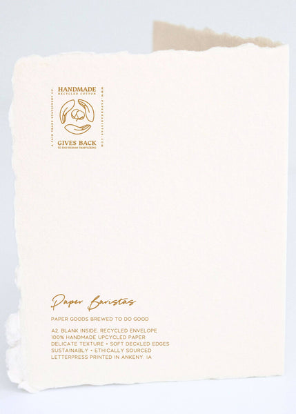 This card is meant to be treasured for years to come. Handmade paper beautiful enough to frame! Size | 8.5"W x 5.5"L Blank inside Comes with envelope Upcycled & Fair...