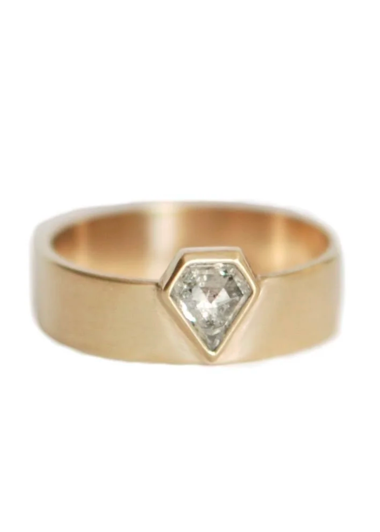 A salt-and-pepper shield cut diamond set just above the edge of the band. 14K gold with platinum insert.