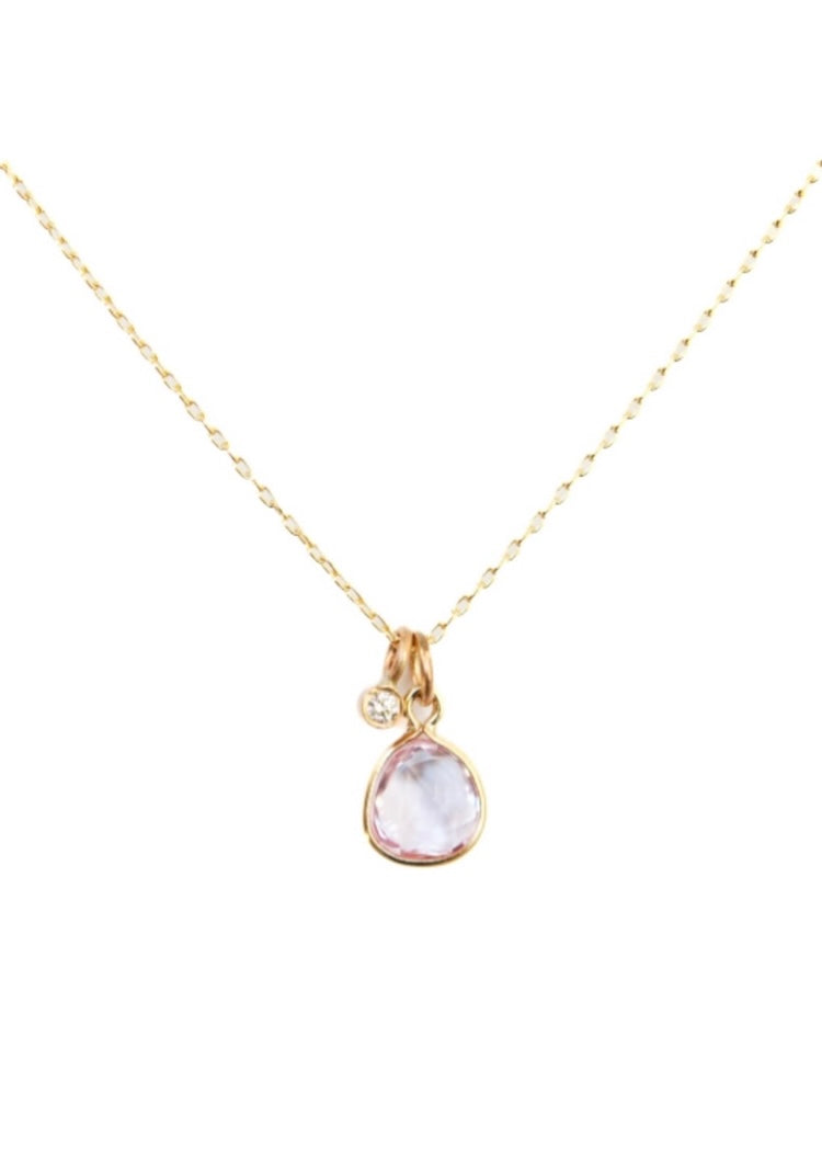 Rose cut pink sapphire and brilliant cut diamond necklace. 14k cable chain and lobster clasp.