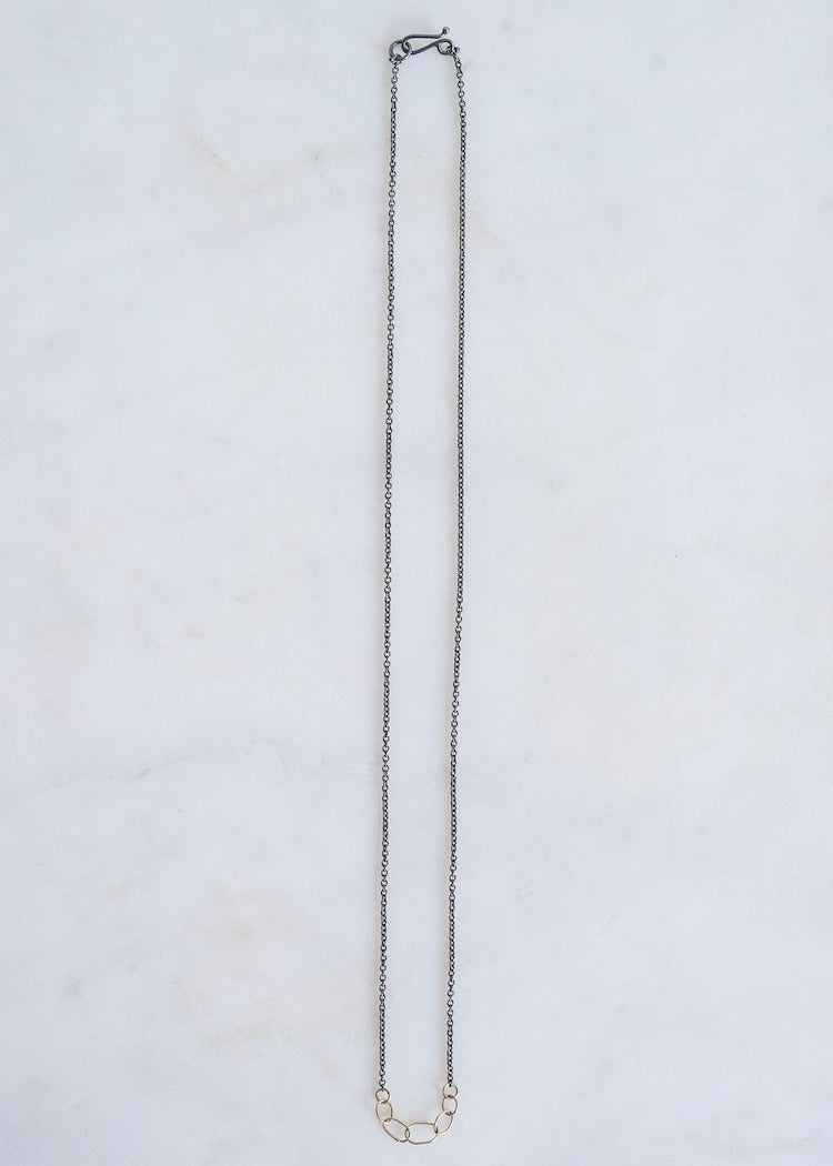 A cluster of handmade 18k gold links on an oxidized silver chain.