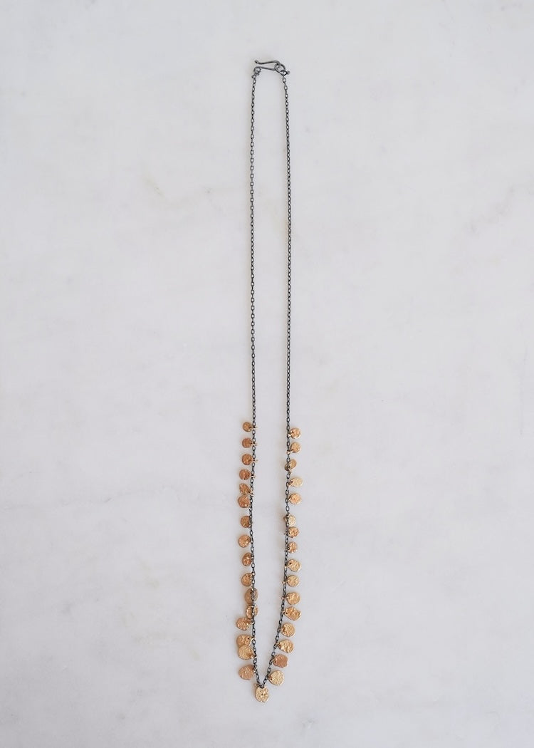 A cascade of 18k gold handmade charms held by 18k gold bead rings on oxidized sterling silver chain.