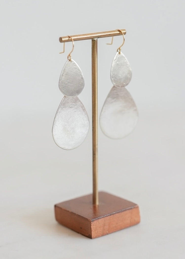 Sterling silver teardrops are textured using an antique hammer, to create a parchment-like effect. Teardrops are connected by an 18k gold spine, and have a lovely subtle movement. 18k gold ear wires.