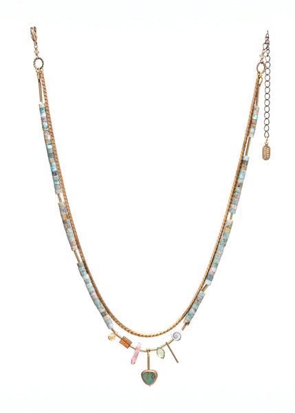 The Austra Necklace has dreamy, ocean tones featuring hand-cut Turquoise with brass edging, Hessonite, Peridot, Rhodochrosite & Shiva Shell paired with Hailey's signature reclaimed brass chain and accents. Material |...