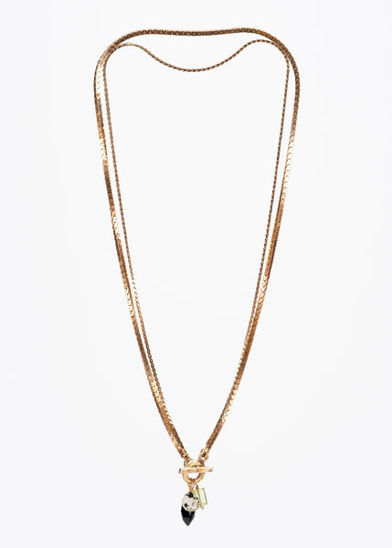 The Vita Necklace features two vintage brass chains with a reclaimed brass toggle clasp. Dalmation Jasper, Peridot, and Black Onyx stones dangle at its front. Material | Artisan-cut natural gemstones,...