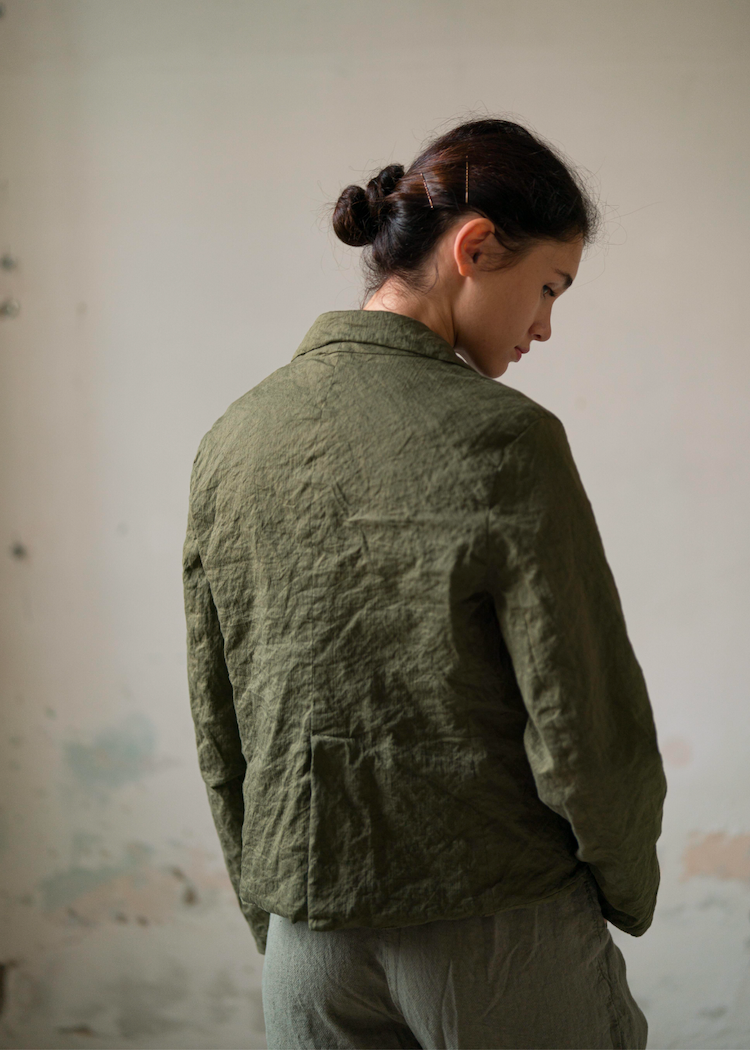 Cotton-steel blend jacket with a crinkle effect. Features a small stand collar, two front pockets that stick out, corozo buttons closure at front and buttoned cuffs. Fully lined in tonal cotton fabric.