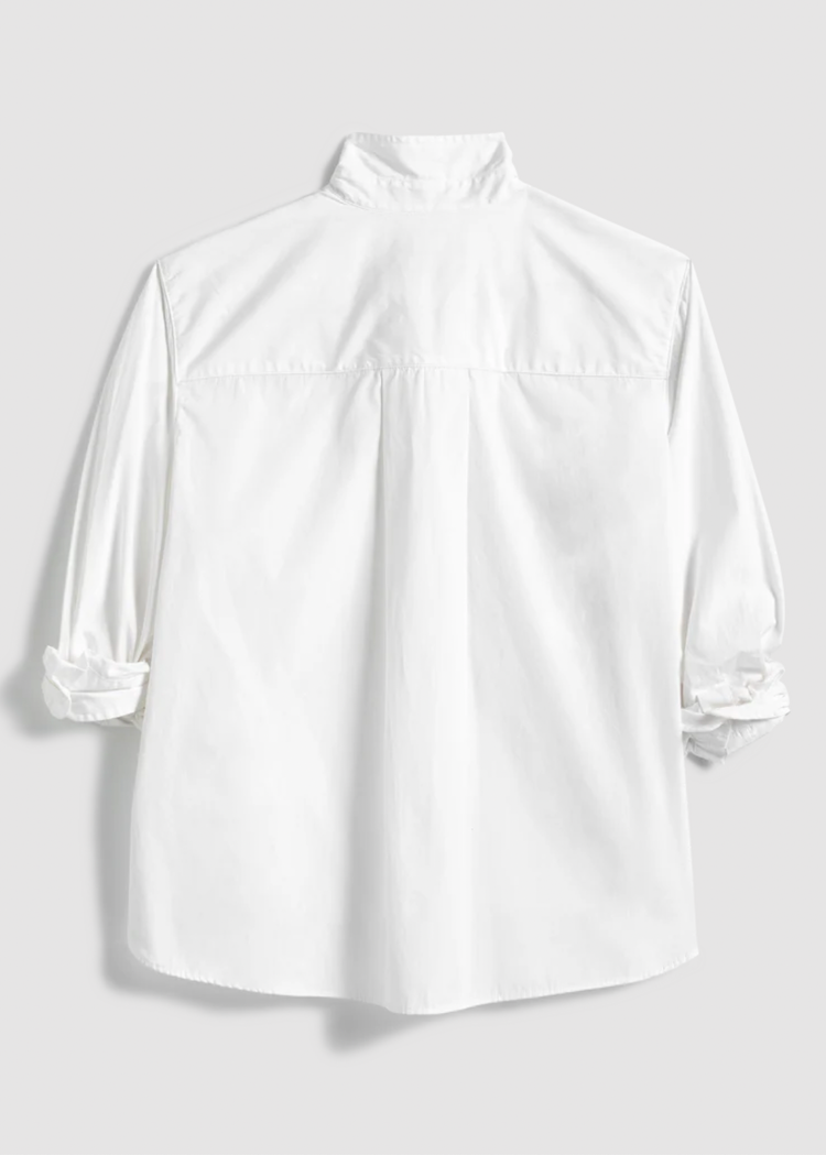 • A petite square fit button-up with a center back pleat and oversized envelope pocket