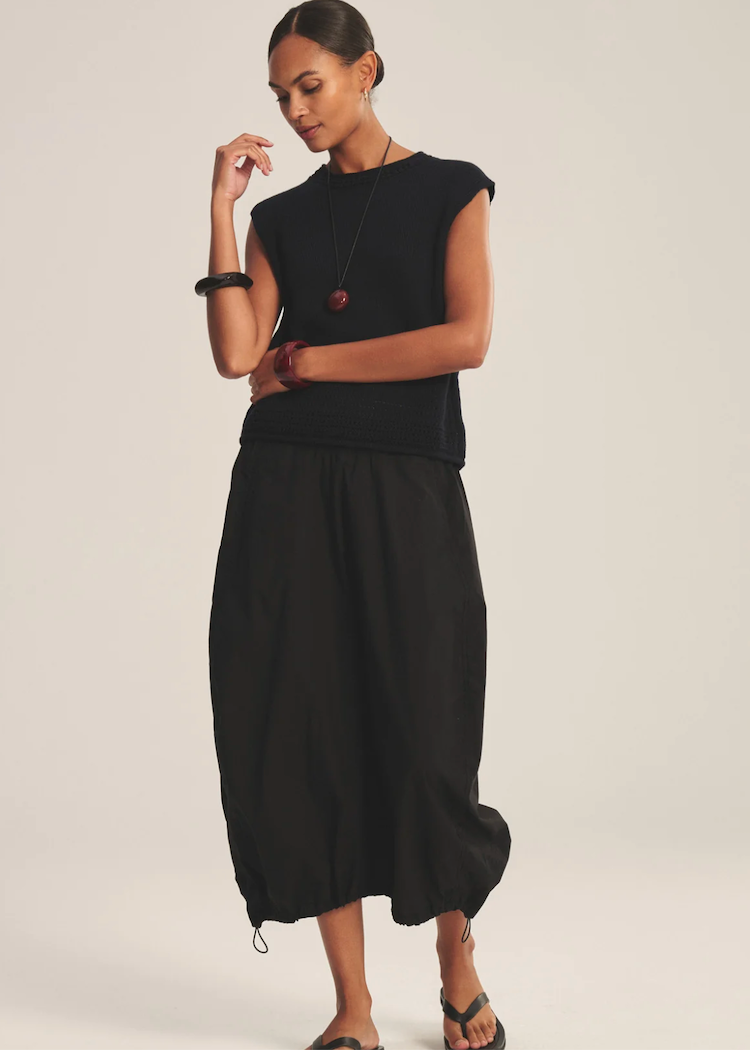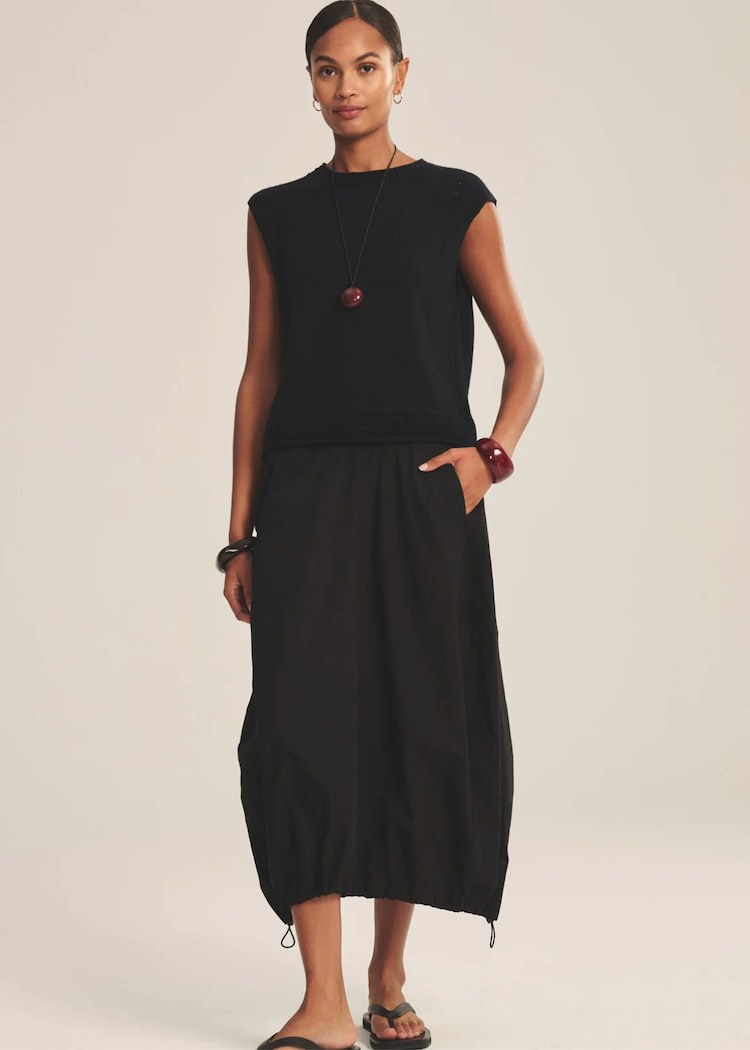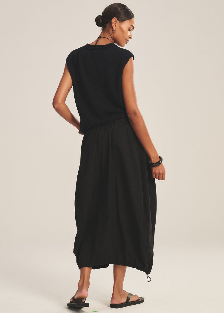 Crafted from crisp cotton poplin, this skirt combines sporty ease with polished detail. Featuring an elastic waist, cinched corded hem, front welt pockets, and a subtle handkerchief hemline, it allows you to move freely while maintaining a flattering silhouette.
