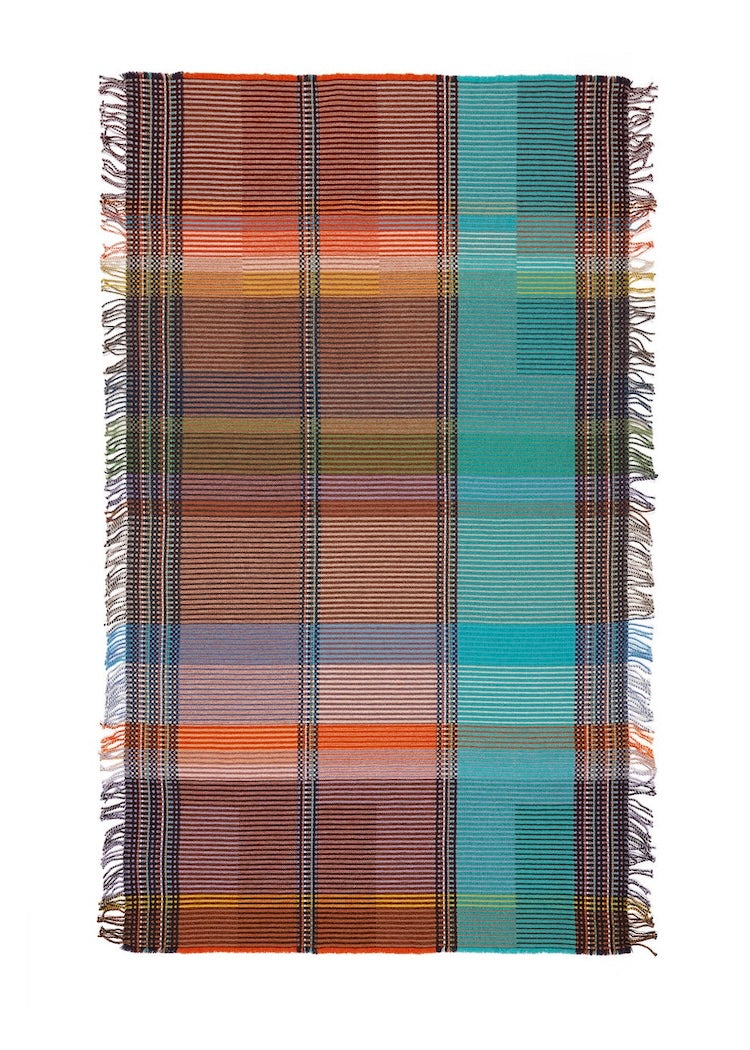 Ida features a bold fiery orange offset with a strong teal in this eye-catching throw, with deeper blueberry tones throughout the intricate striped sections.