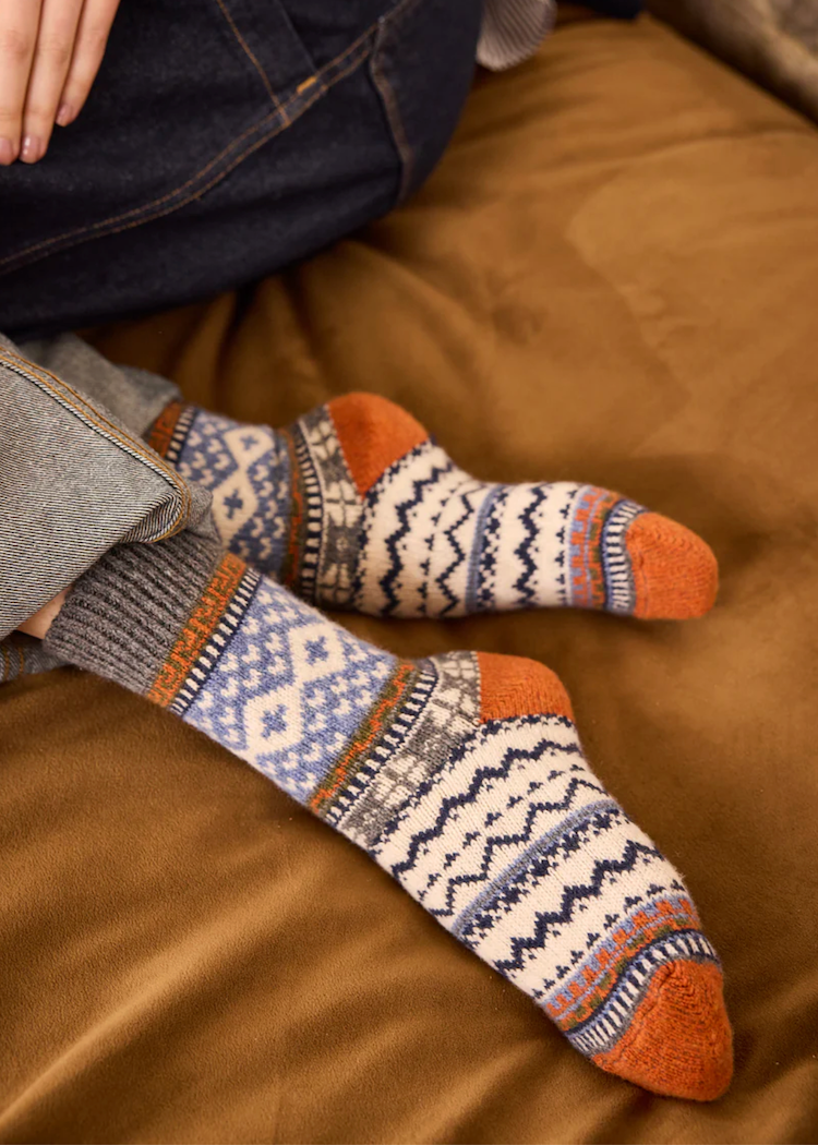 It's a perfect sock to wear with a pair of hiking boots or rain boots, not just because of its chunk but also because of the thermo regulating properties of merino wool.. Also a great sock worn solo, puttering in the kitchen on a cold winter morning.