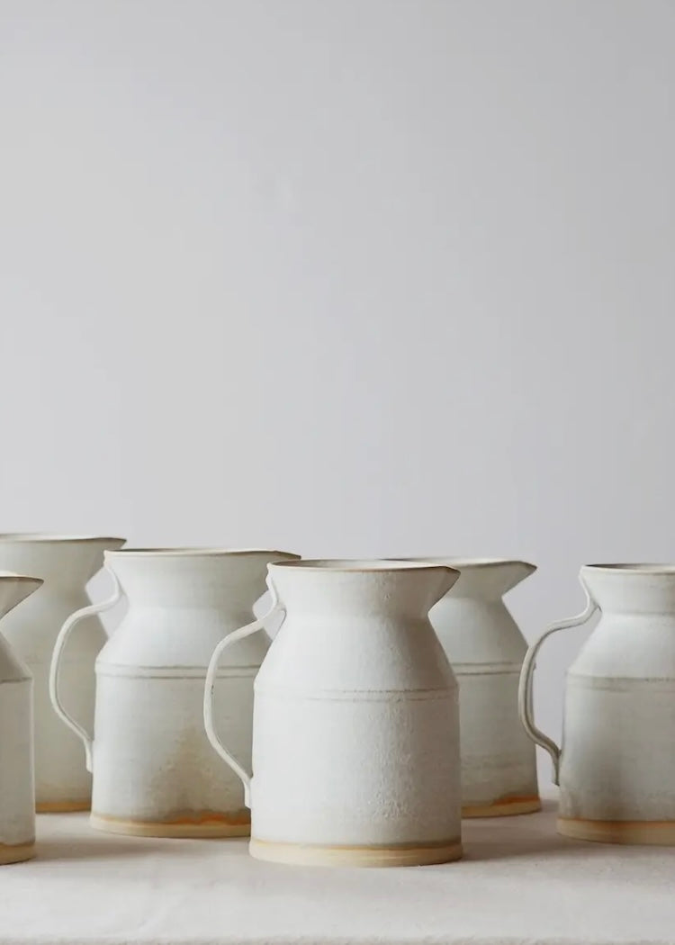 Tea or coffee jug ideal for making your breakfasts special. Handmade with clay and glazed in white/cream, baked at high temperature for greater resistance and longer lifetime. This enamel, when melted in the oven, creates different shades between white, cream, yellow and light brown, resulting in a set of pieces with a variable finish. Unique piece made with a lot of dedication and love. Each part of the jug was shaped manually with the use of a lathe.