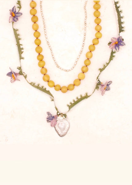 Antique lavender garland crochet with a fine silver Peruvian heart milagro, hand stitched antique pearl details, collectable heritage craft & one of a kind. Wear as a blessing and maker...