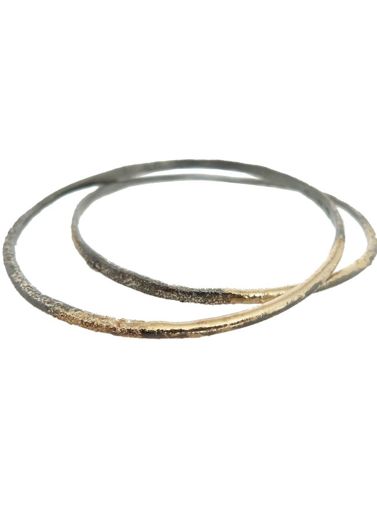 One of our favorites from KMJ! Easily layered with bangles you already have or it looks perfect on its own. Each bangle is hand-forged to a crescent shape that transitions from the side profile to the front. No two are alike. Smooth 18k fused gold melds seamlessly with textured 18k gold dust.